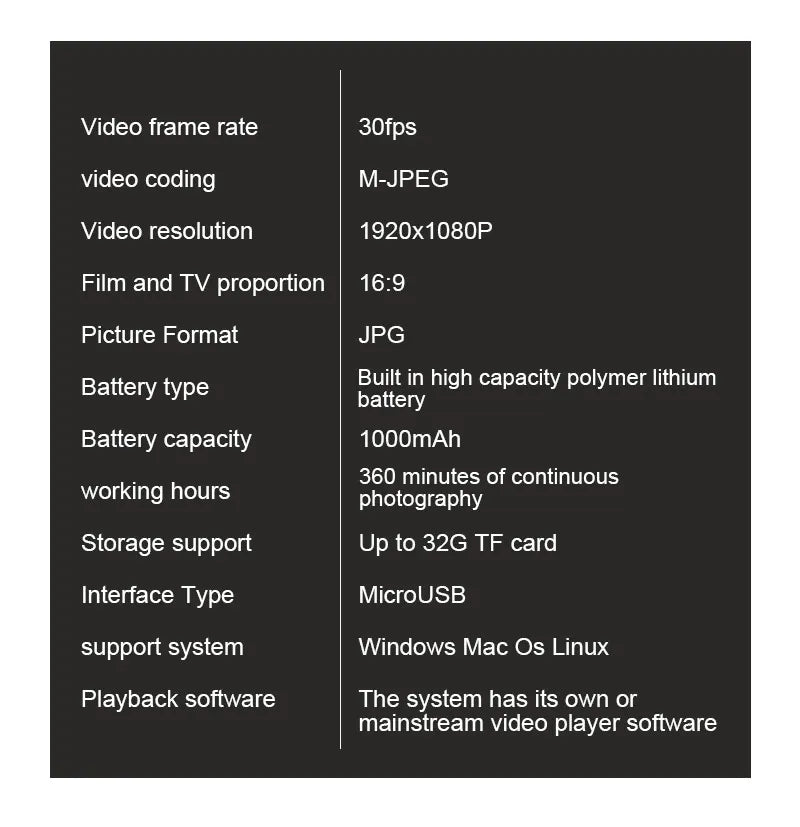 This compact and versatile mini camera is perfect for capturing high-quality video and audio on the go. With full HD 1080P resolution, it offers crystal-clear recordings whether you're documenting a road trip, participating in sports, or performing professional tasks. The camera supports TF memory cards from 8GB to 256GB, allowing ample storage for your recordings. Its durable plastic shell is built to withstand everyday use, and its simple one-key operation makes recording effortless.