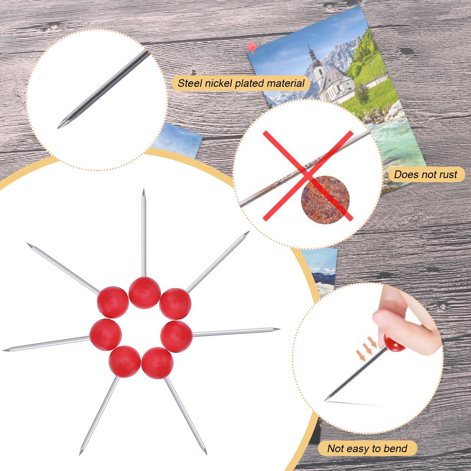 Elevate your organization game with this versatile push pin set, crafted from durable alloy for long-lasting performance. Perfect for securing photos, maps, and more, these pins are suited for home, office, school, and beyond. The compact design ensures they're easy to carry and the large plastic head makes them effortless to use.