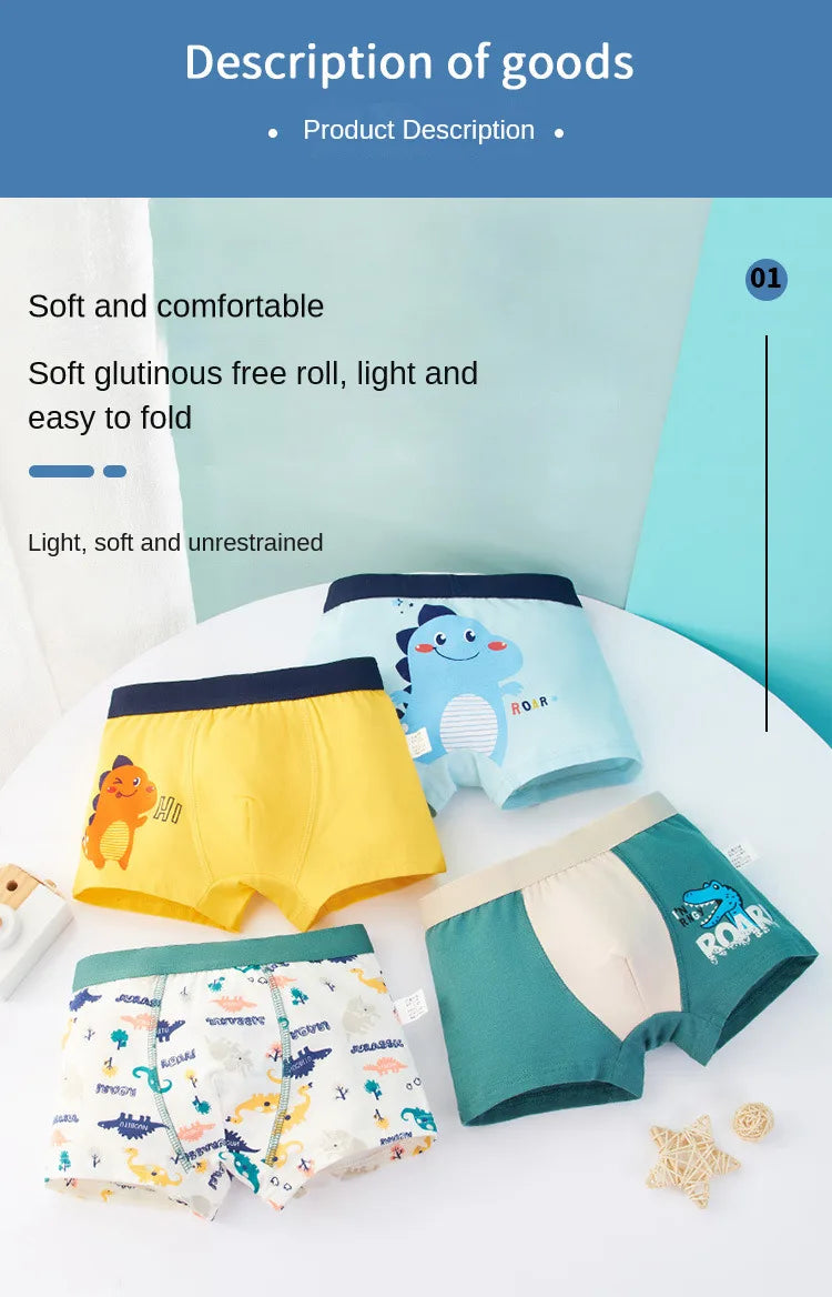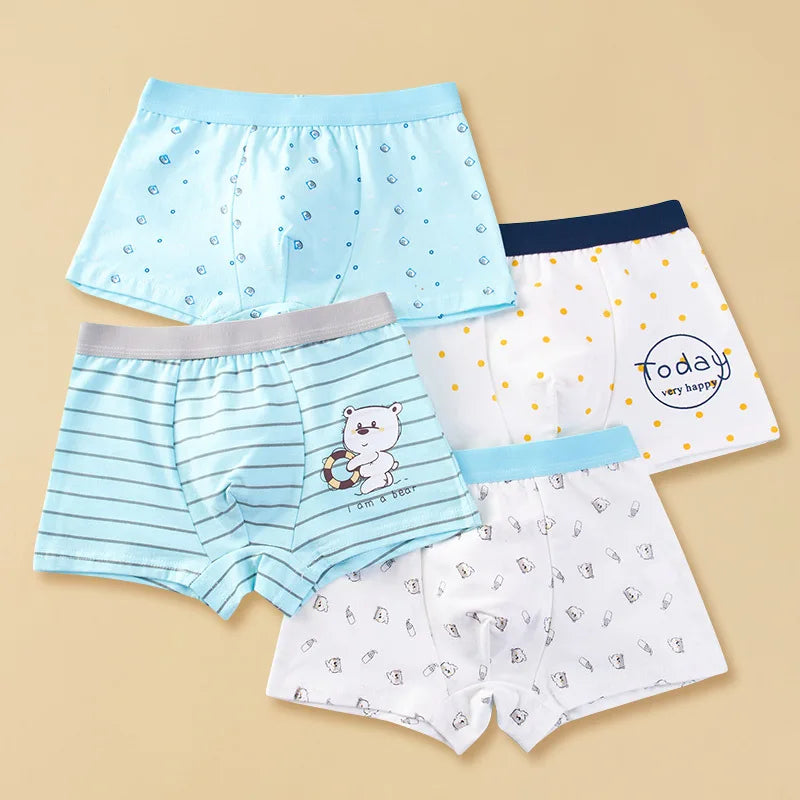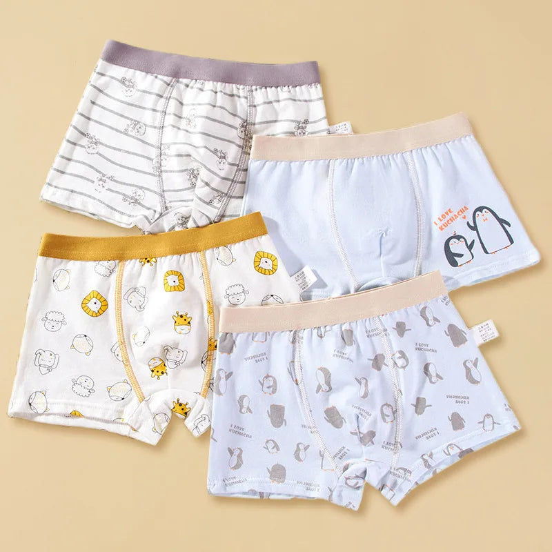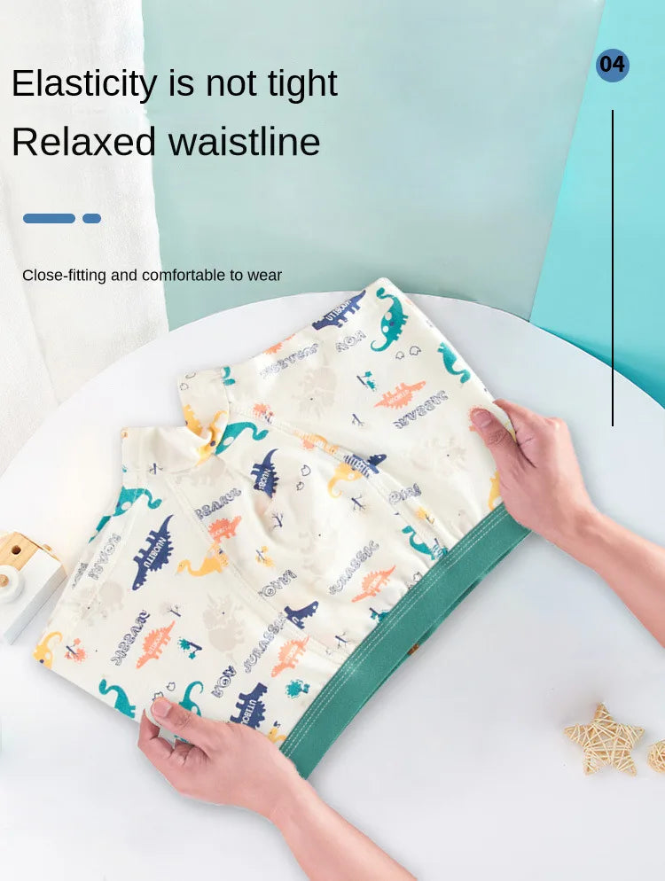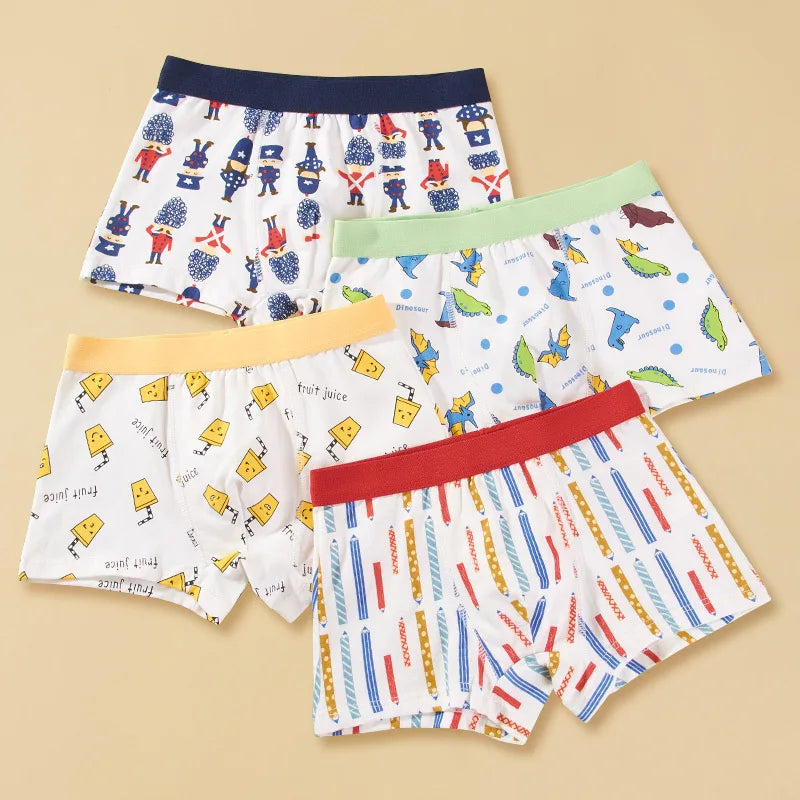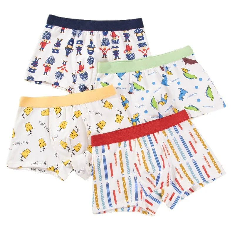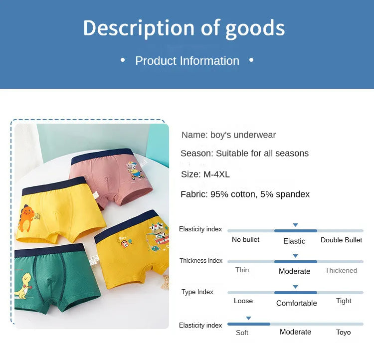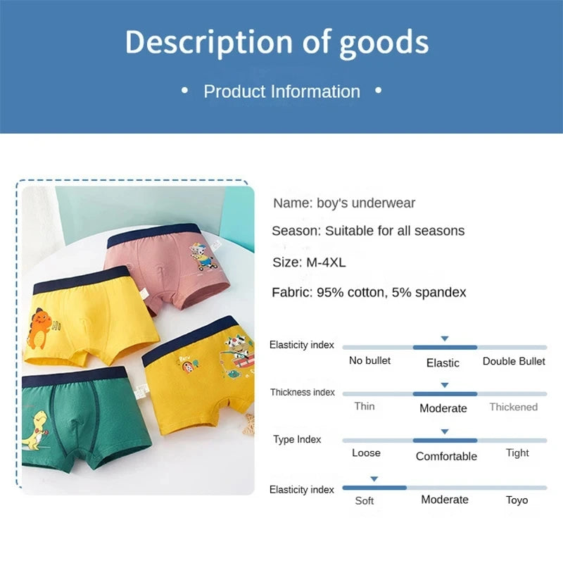 Introduce comfort and fun to your child's wardrobe with these boys' cartoon underwear sets. Made from a soft blend of 95% cotton and 5% spandex, these panties offer a gentle fit that adapts perfectly for everyday wear. Designed to accommodate heights of 80-155 cm, they ensure a snug fit for children aged 4-6 years. Each set includes four pairs of underwear, perfect for all seasons. With playful cartoon patterns, these underwear not only provide comfort but also add a dash of fun to your child's daily outfits.