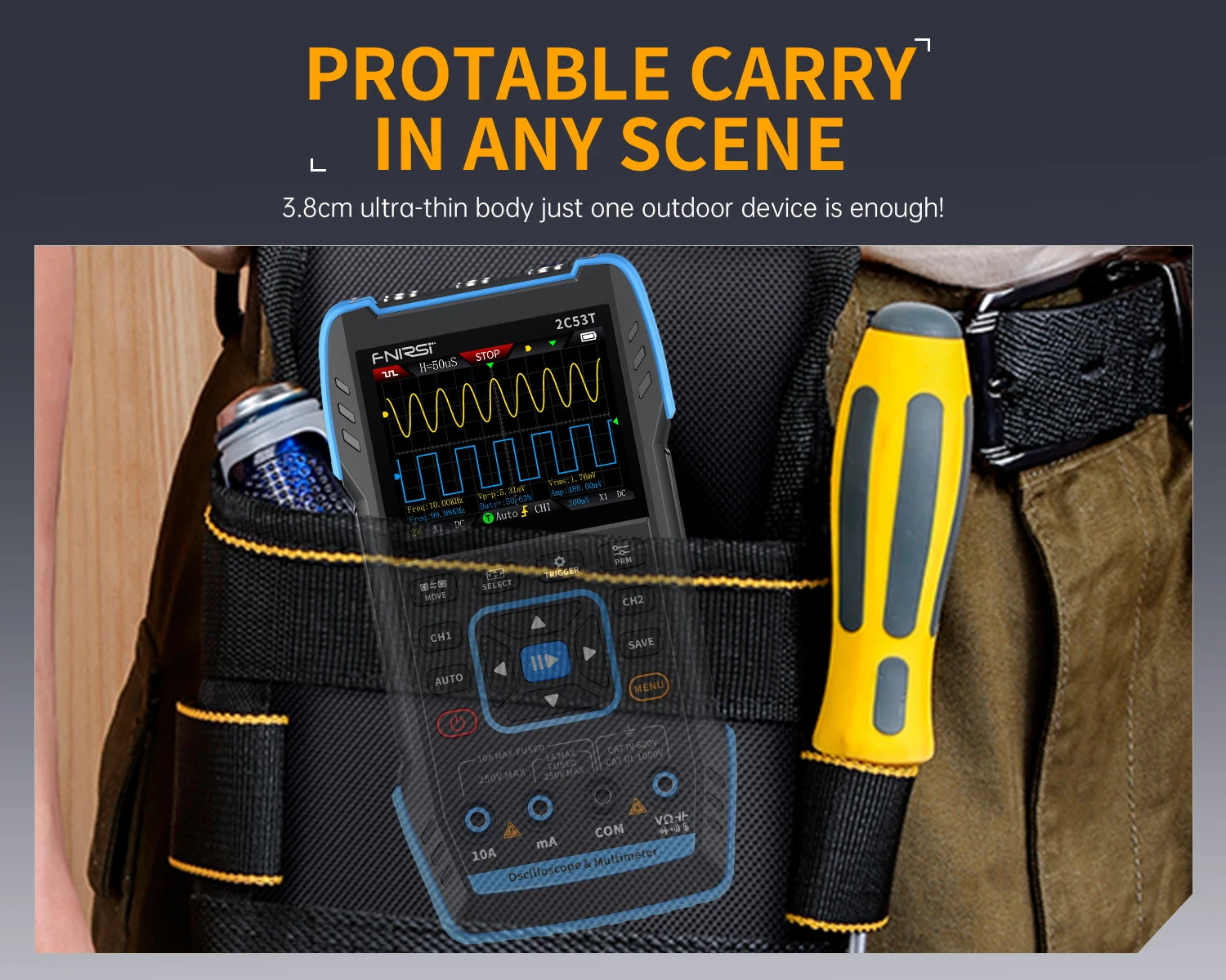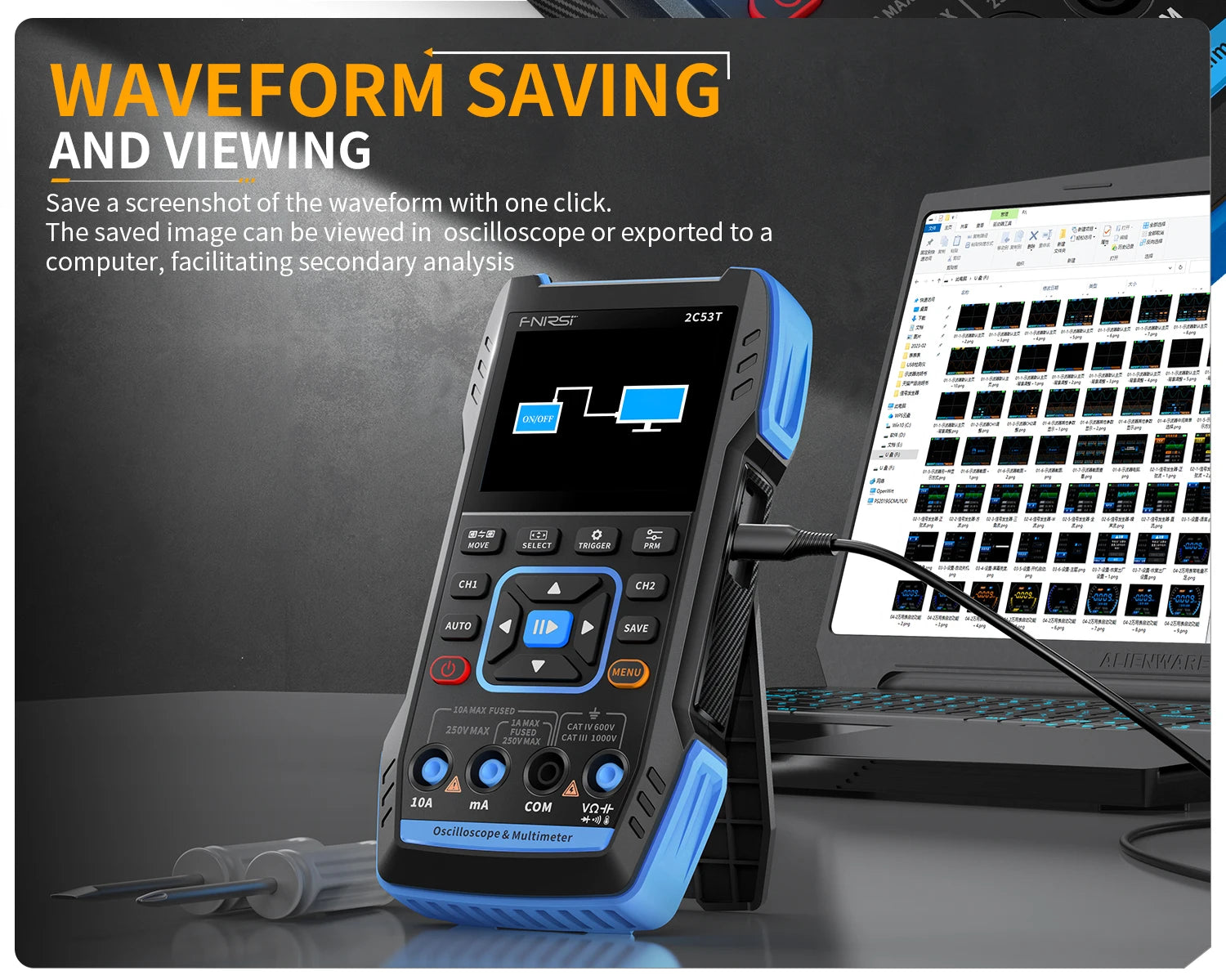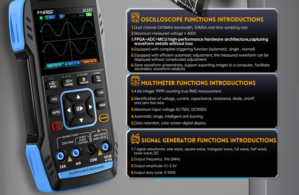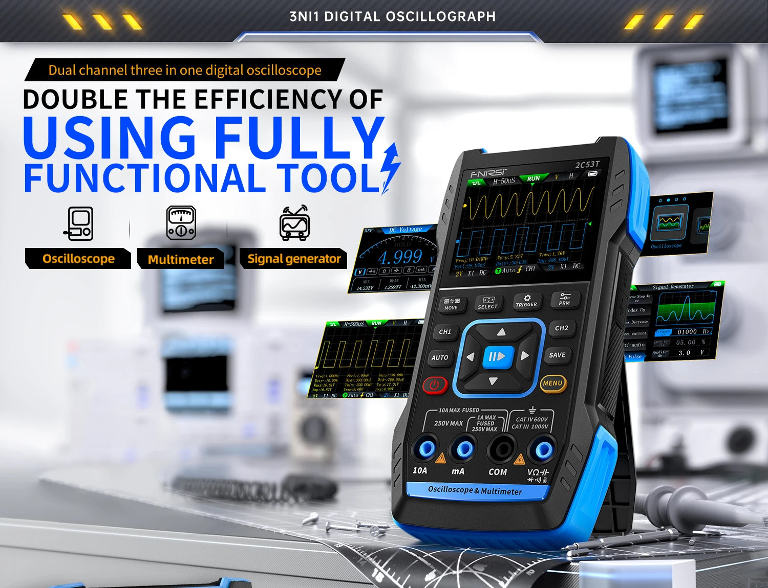 The 2C23T and 2C53T are versatile 3-in-1 devices that combine the functionality of an oscilloscope, multimeter, and signal generator, ideal for professionals and enthusiasts in maintenance, development, and education.