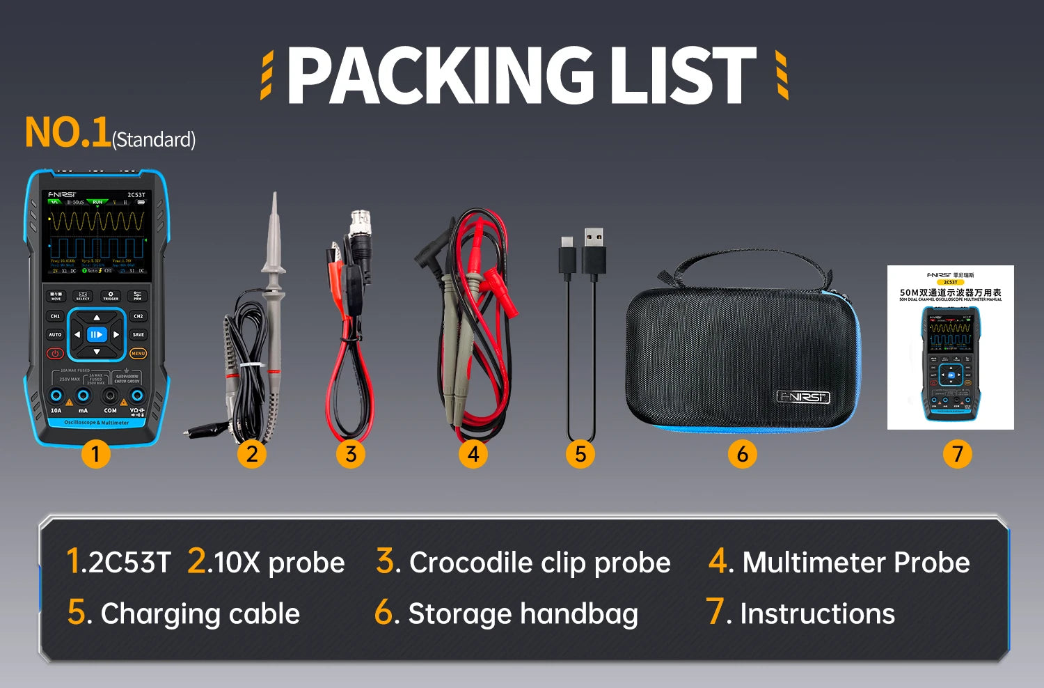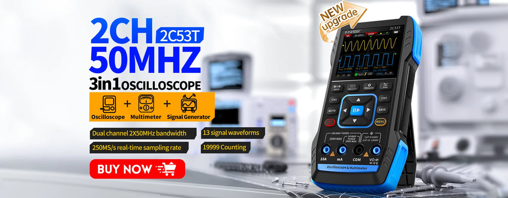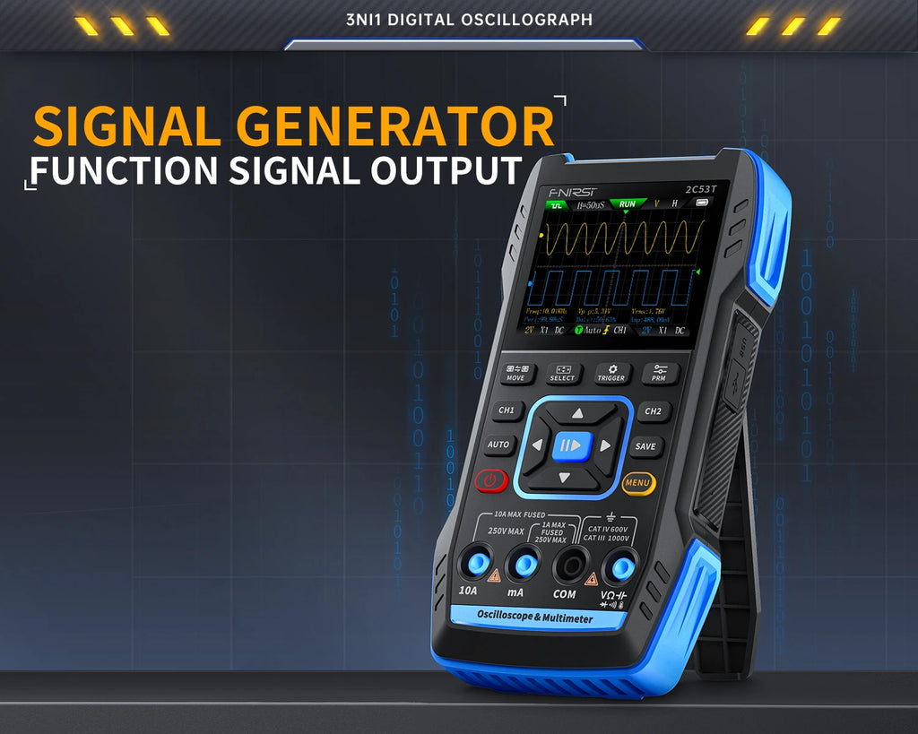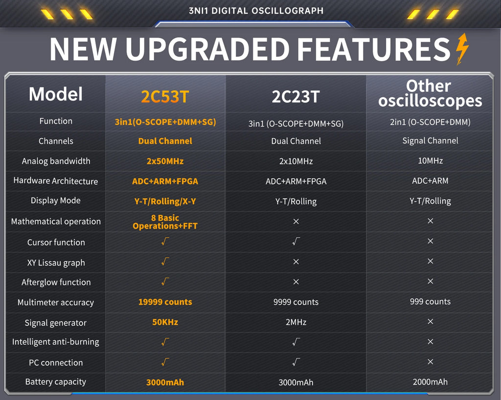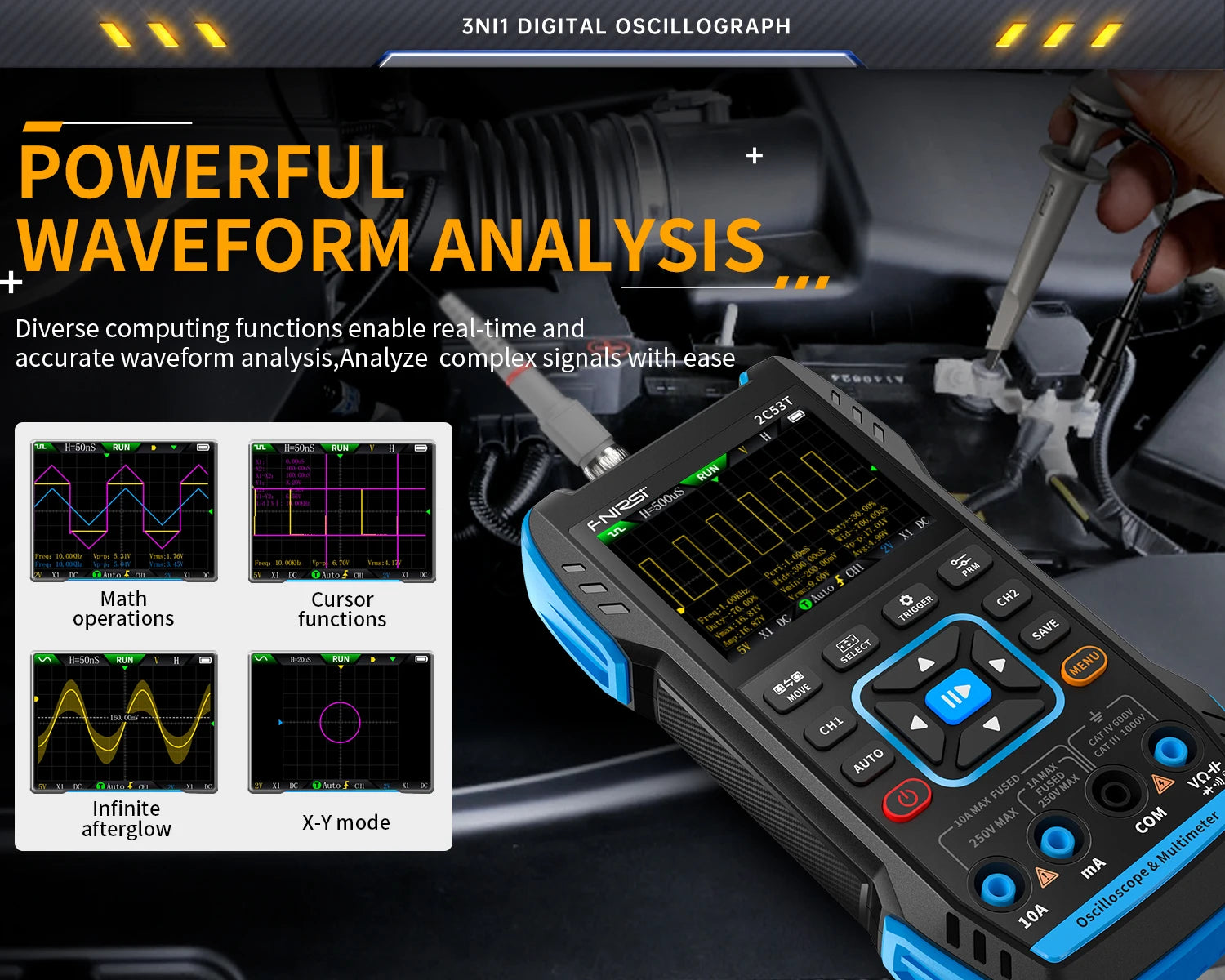 The 2C23T and 2C53T are versatile 3-in-1 devices that combine the functionality of an oscilloscope, multimeter, and signal generator, ideal for professionals and enthusiasts in maintenance, development, and education.