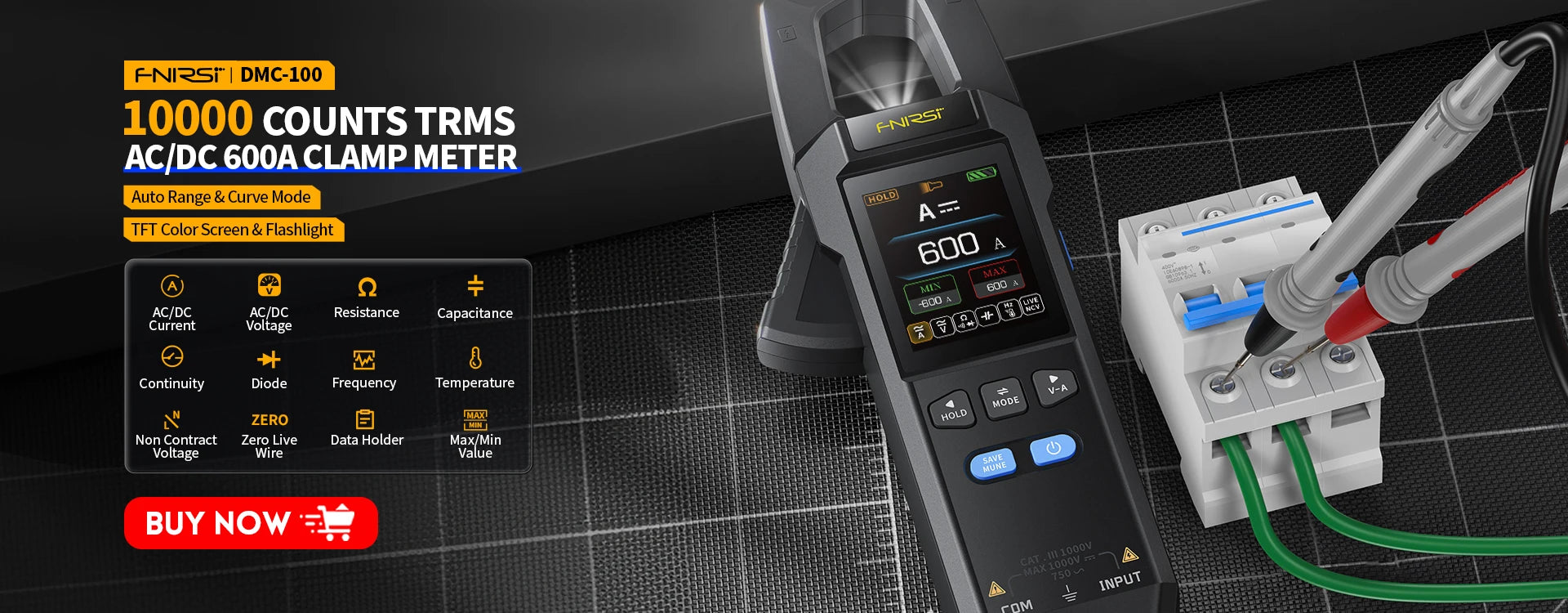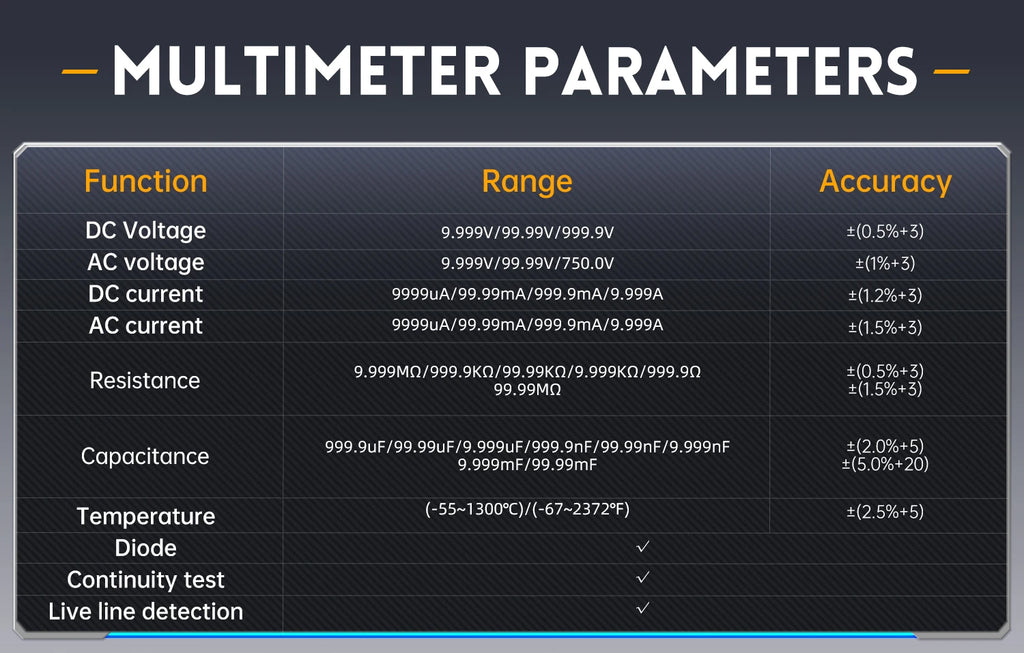 - Multimeter: Measures DC voltage (up to 999.9V), AC voltage (up to 750V), DC/AC current (up to 9.999A), resistance, capacitance, temperature, supports diode and continuity tests, live line detection.