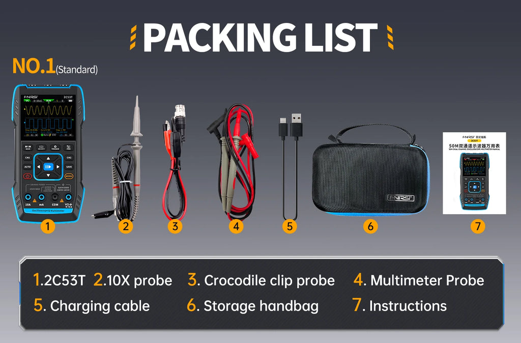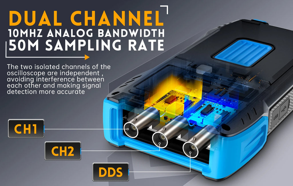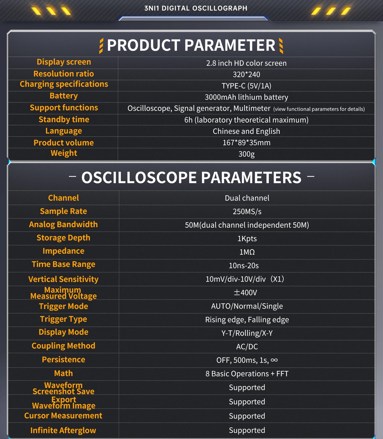 - Oscilloscope: 50MS/s sampling rate, 10MHz bandwidth, dual-channel, supports AC/DC coupling, AUTO/Normal/Single trigger modes.