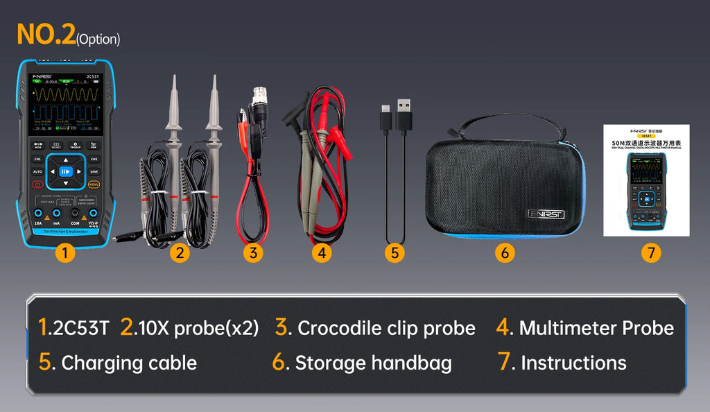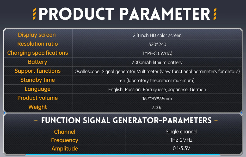 - Signal Generator: Outputs 7 signal types up to 2MHz, 1Hz frequency adjustments.