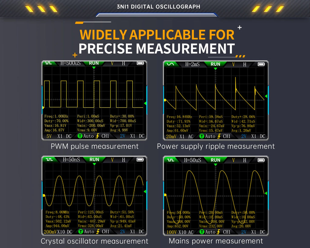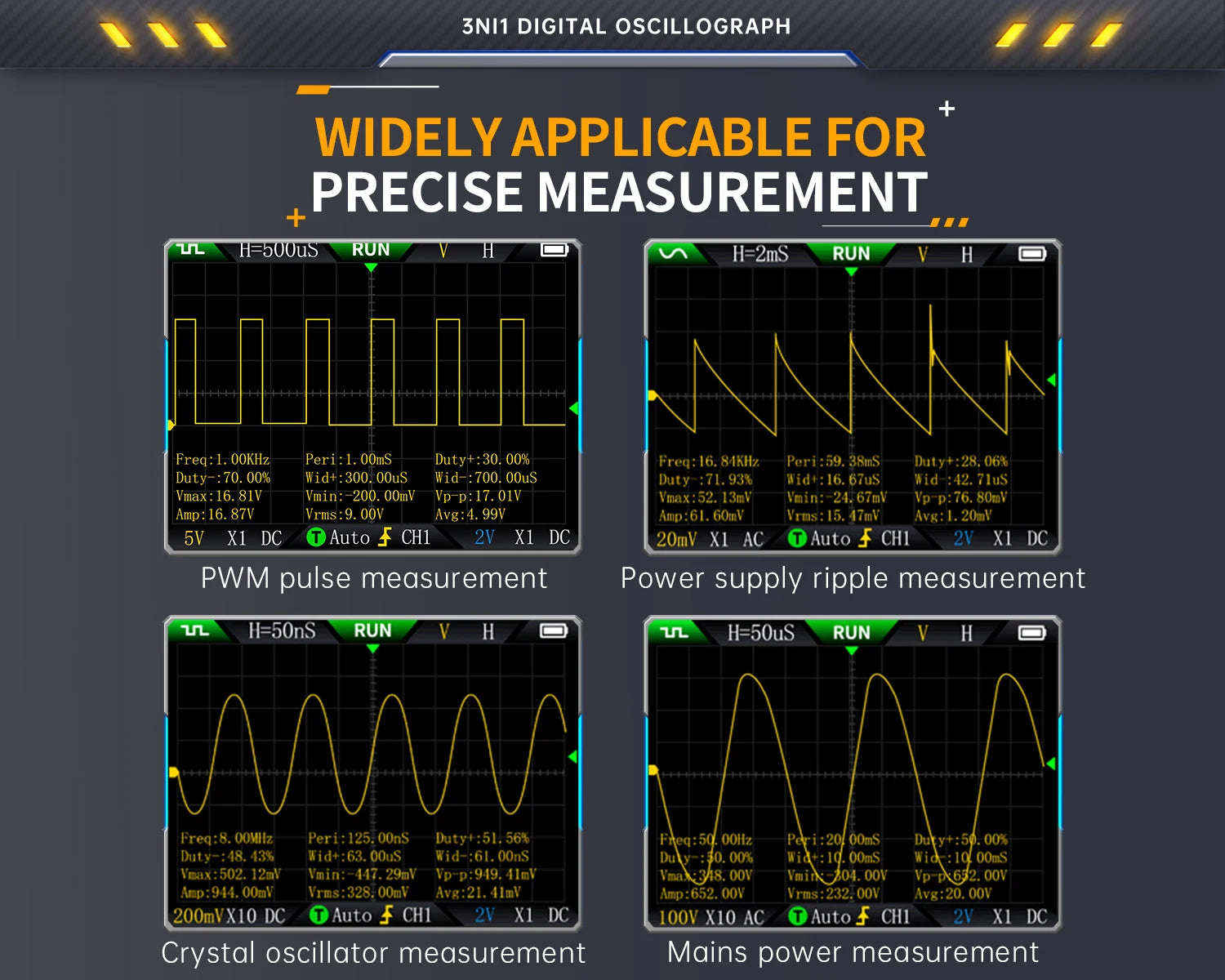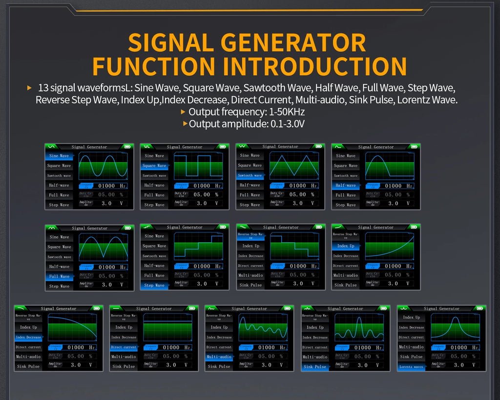 - Signal Generator: Outputs 13 signal types up to 50kHz, fine-tuning available.