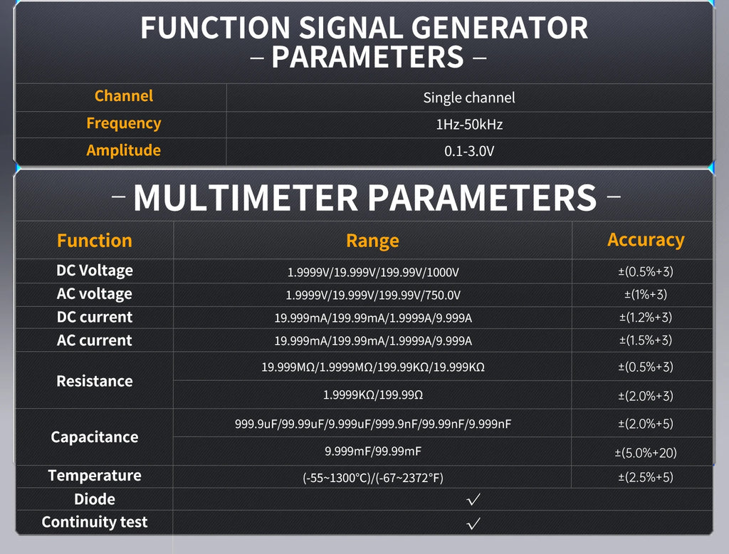 - Multimeter: Enhanced 4.5-digit true RMS, expanded range for precision.