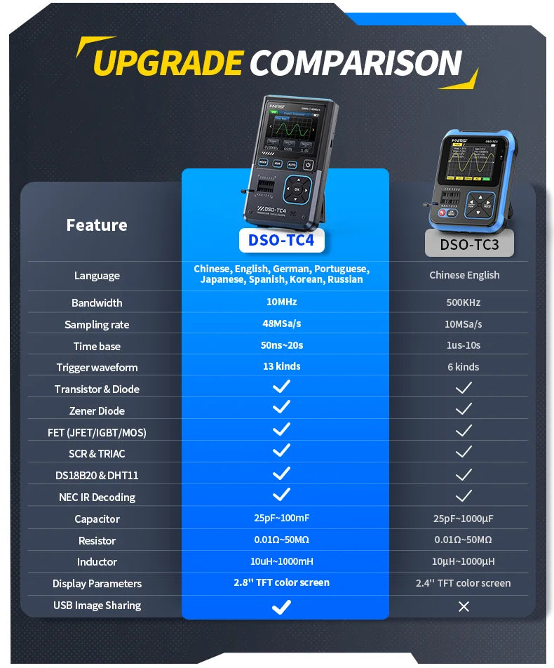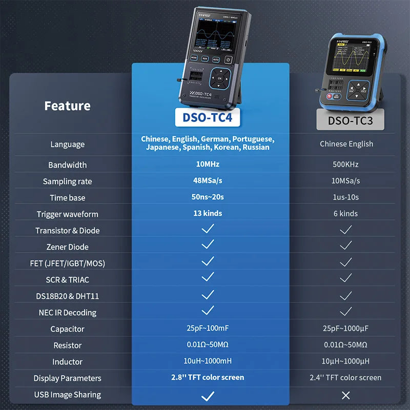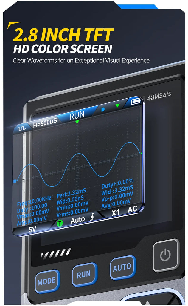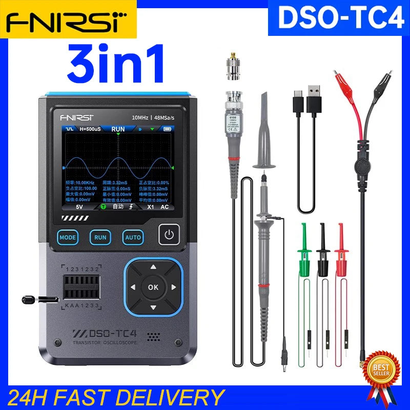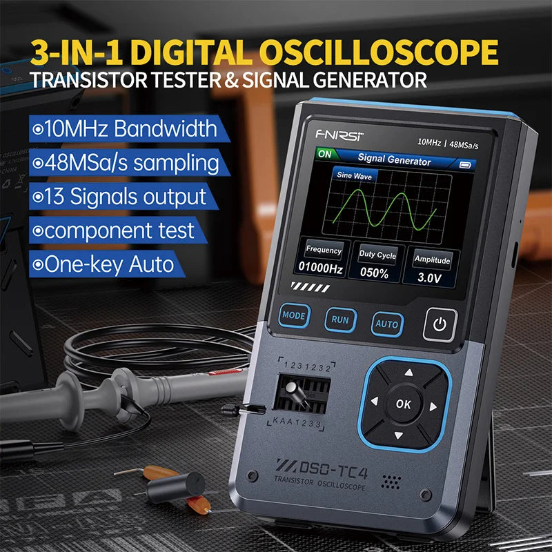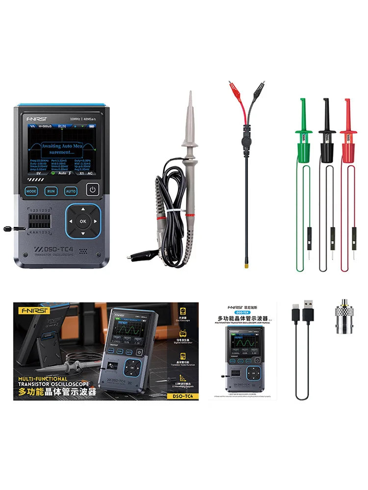 The DSO-TC4 is a versatile and compact multifunctional oscilloscope, perfect for both maintenance professionals and R&D sectors. This tool combines an oscilloscope, signal generator, and transistor tester into one efficient device. With a real-time sampling rate of 48MSa/s and an analog bandwidth of 10MHz, it offers precise measurements and analysis. The device supports various automatic measurements like Max, Min, Avg, RMS, Vpp, Frequency, Cycle, and Duty Cycle, making it an essential gadget for detailed evaluations.