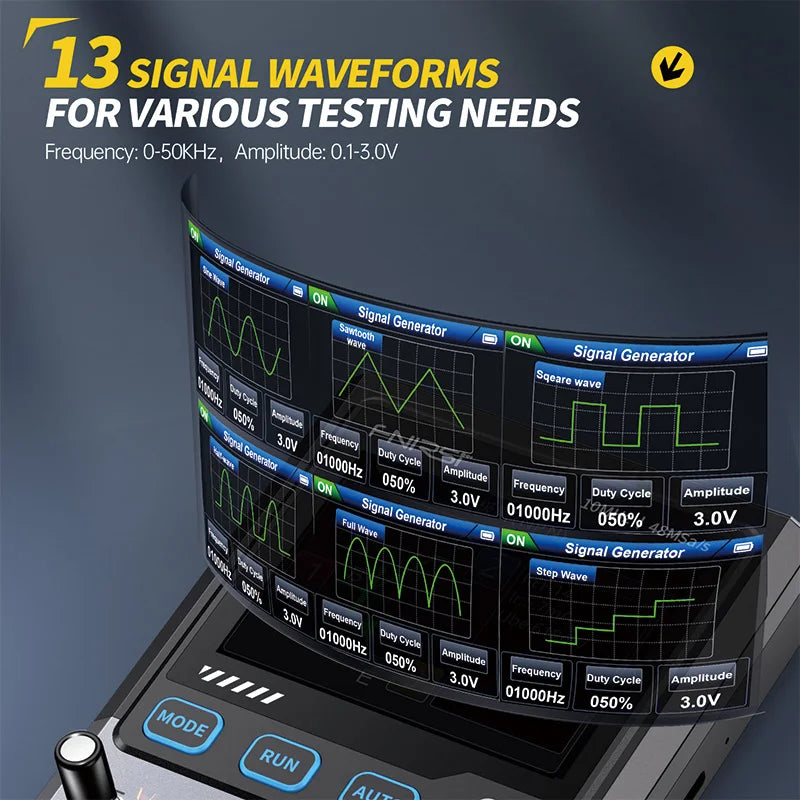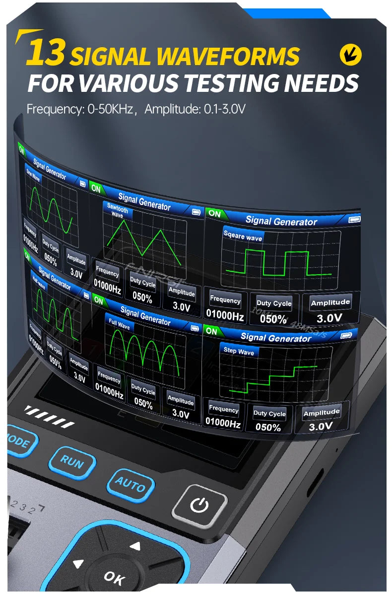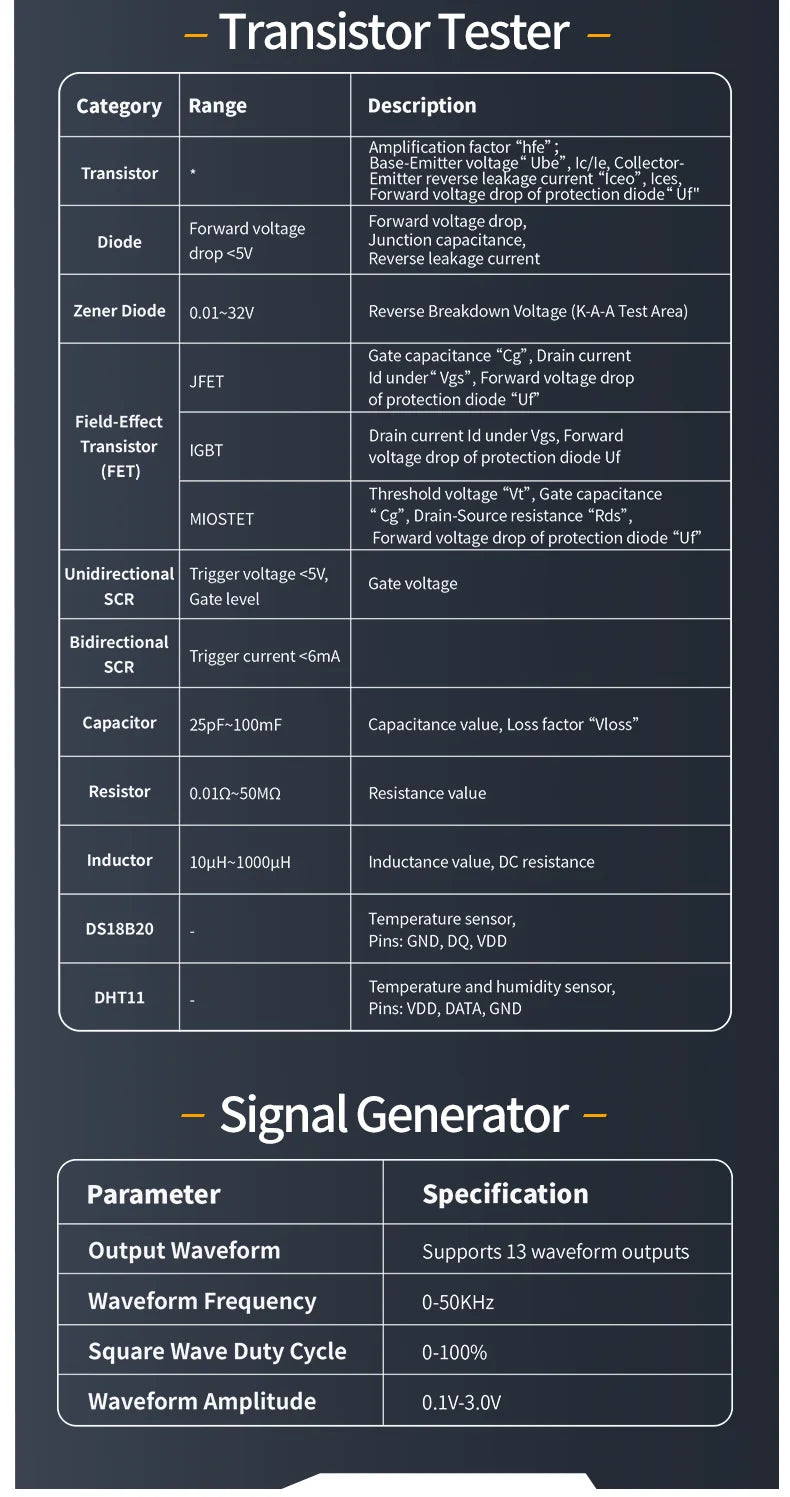 The signal generator function provides 13 waveform outputs with a frequency range of 0-50KHz and adjustable output parameters, offering flexibility for diverse applications. As for the transistor function, it efficiently detects and analyzes components such as transistors, diodes, and field-effect transistors (FETs). Its automatic identification of component type and pin arrangement simplifies operations and enhances testing efficiency.