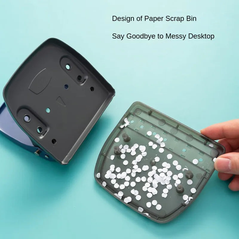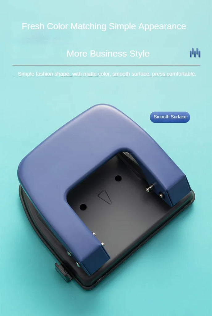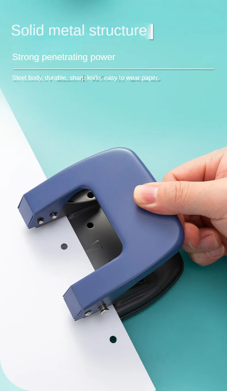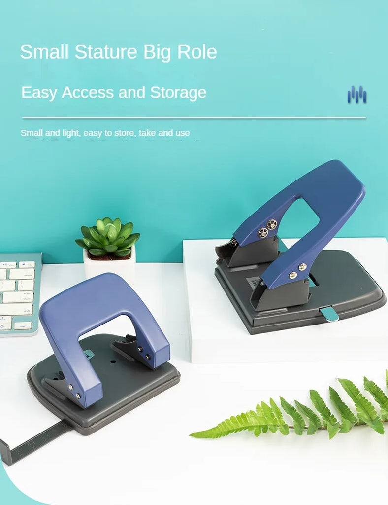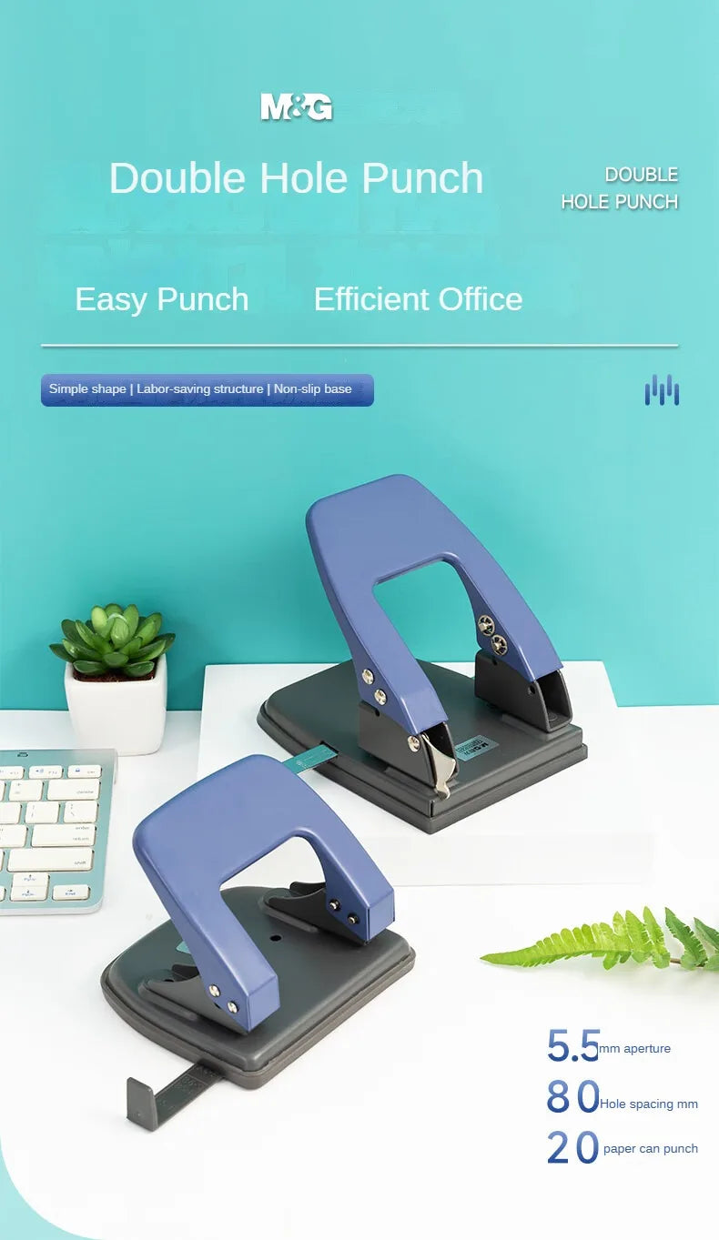 Compact Double Hole Punch 5.5mm Diameter, 80mm Space with Ruler, 20 Page Capacity, Blue