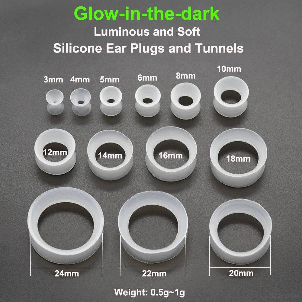 Glow-in-the-Dark Silicone Ear Plugs & Tunnels 3mm-24mm Stretchers for Men & Women, 3pcs Set