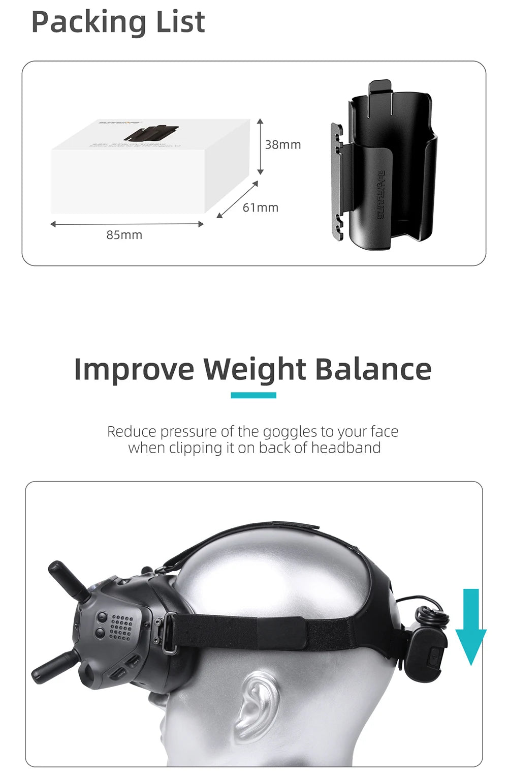 Elevate your DJI FPV experience with our expertly designed drone accessory, crafted for seamless integration and ultimate comfort. This lightweight accessory, weighing just 16g, is made from durable plastic and features a soft sponge-lined contact area for maximum comfort. Ideal for DJI FPV Goggles V2, it includes a convenient battery back clip to securely hold the battery on the back, ensuring a balanced and uninterrupted flight.