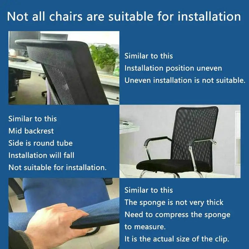 Our headrest is compatible with various chair sizes. Choose the correct installation size based on your chair’s backrest measurements: 2.2cm for 1.0cm to 2.0cm thickness, 2.6cm for 2.0cm to 2.4cm, and 3.0cm for 2.4cm to 2.8cm. Note that if your chair's backrest sponge is too thick, installation with a fixing clip might not be feasible.