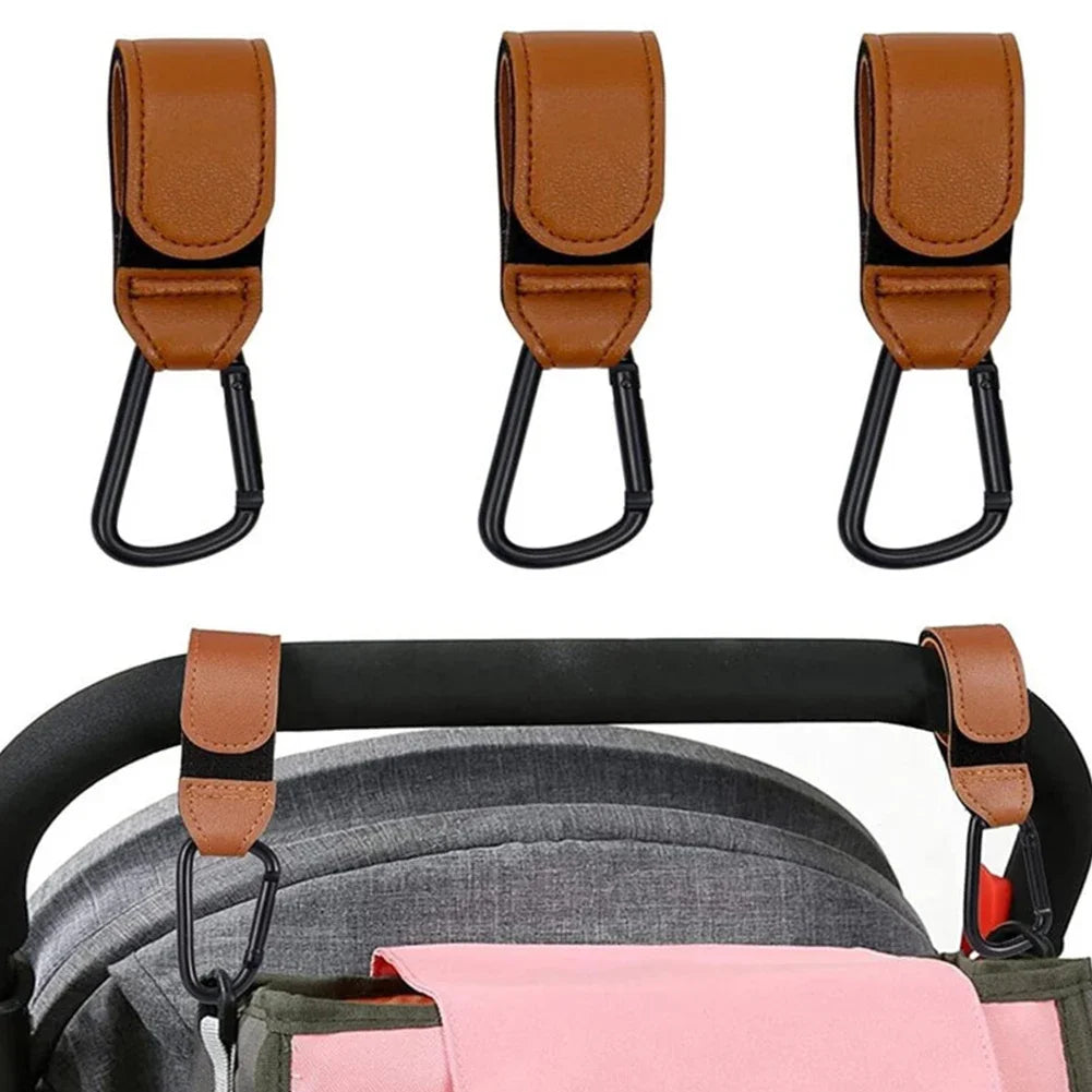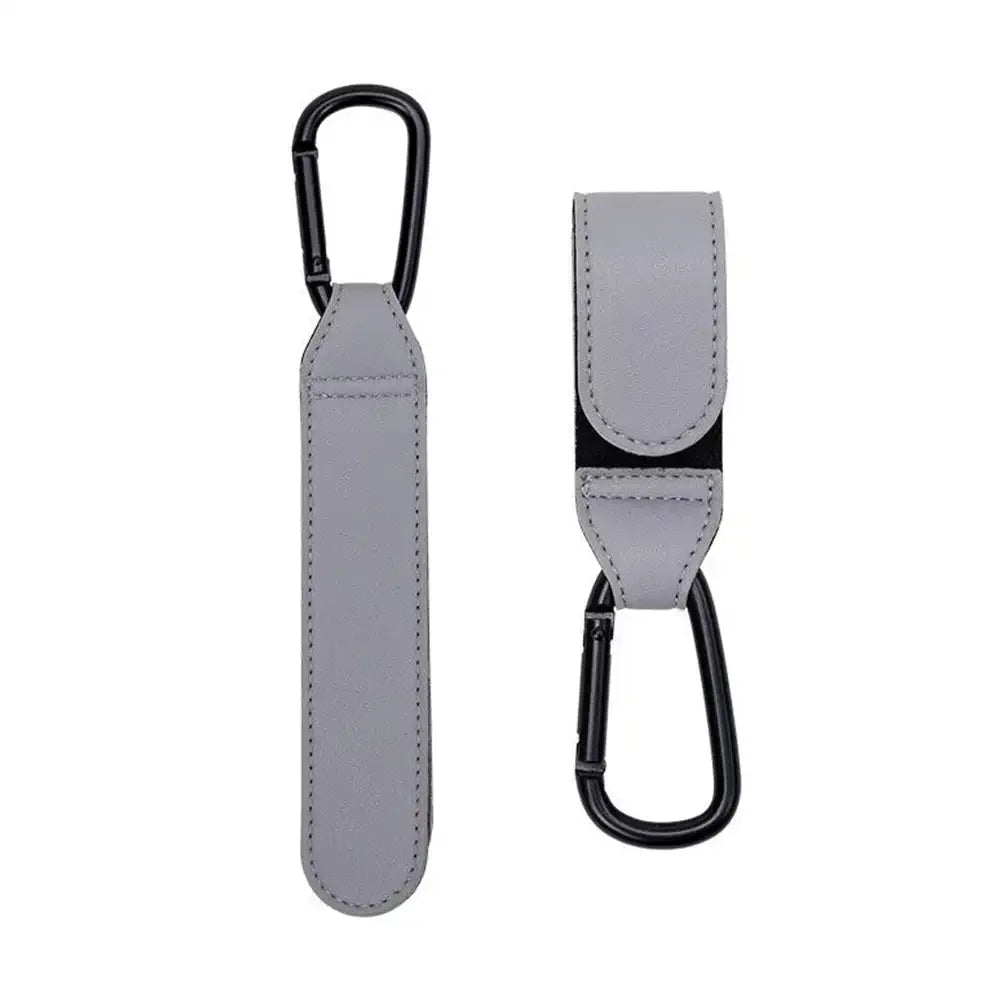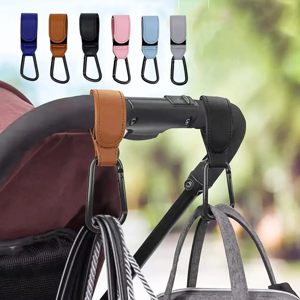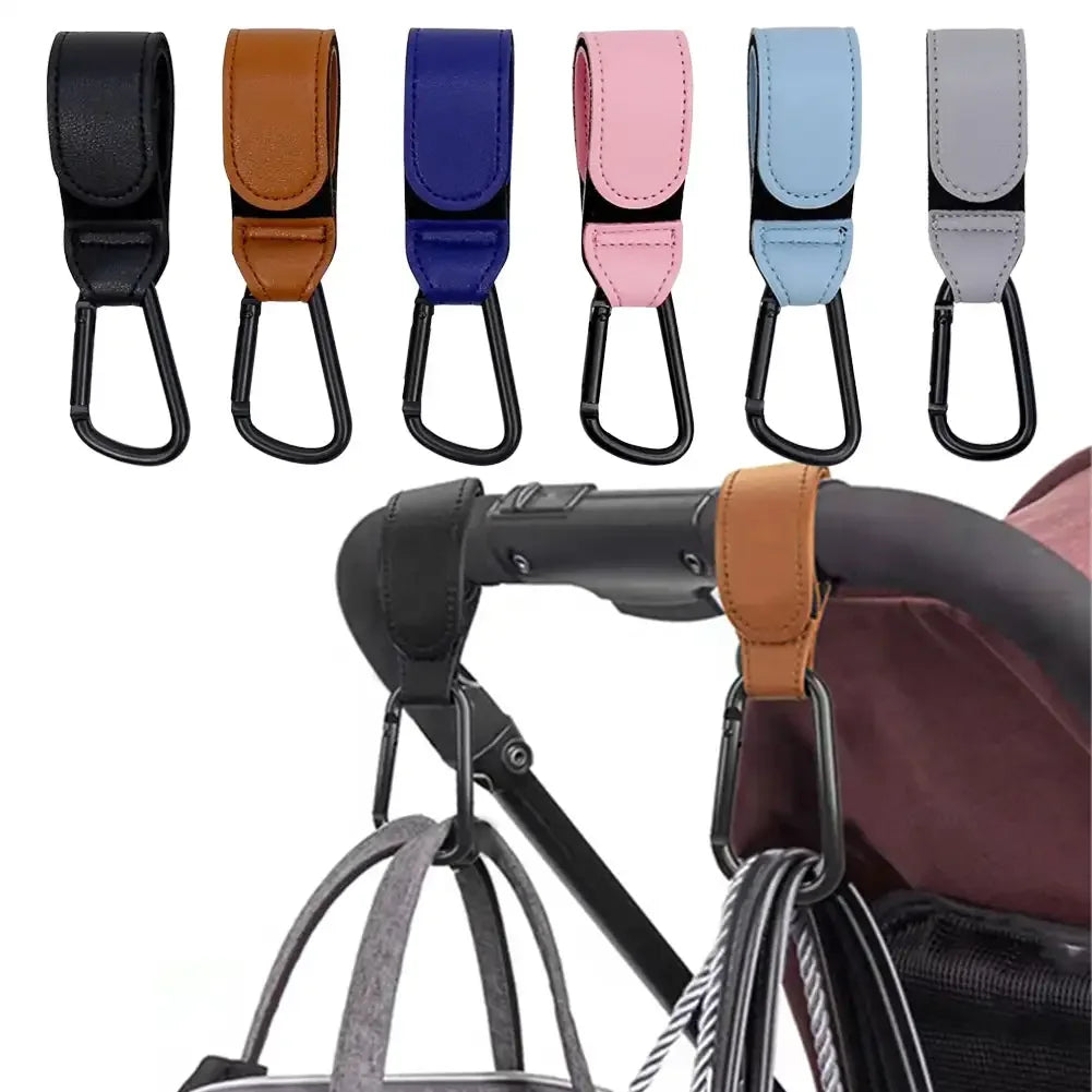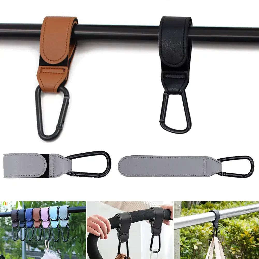 Baby Stroller Hooks Clips - Aluminum Carabiner for Pram Diaper Bag Hanging - PU Leather Strap Accessories