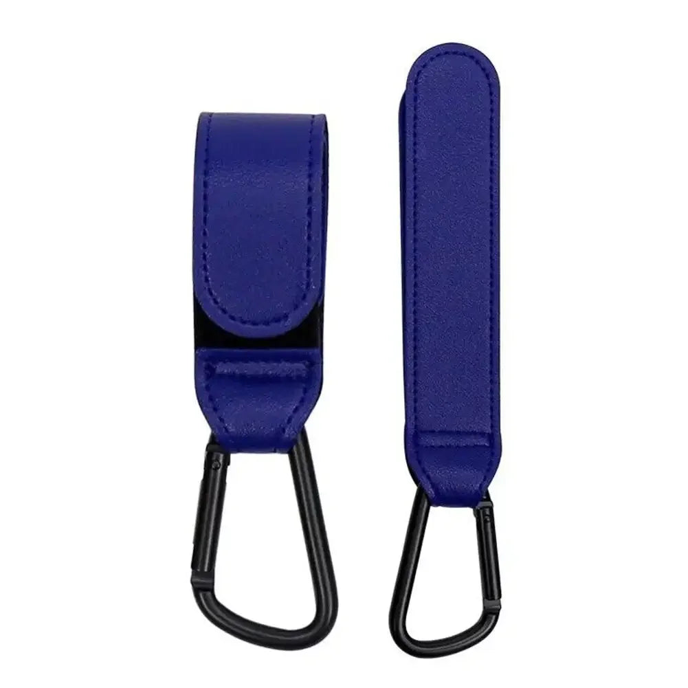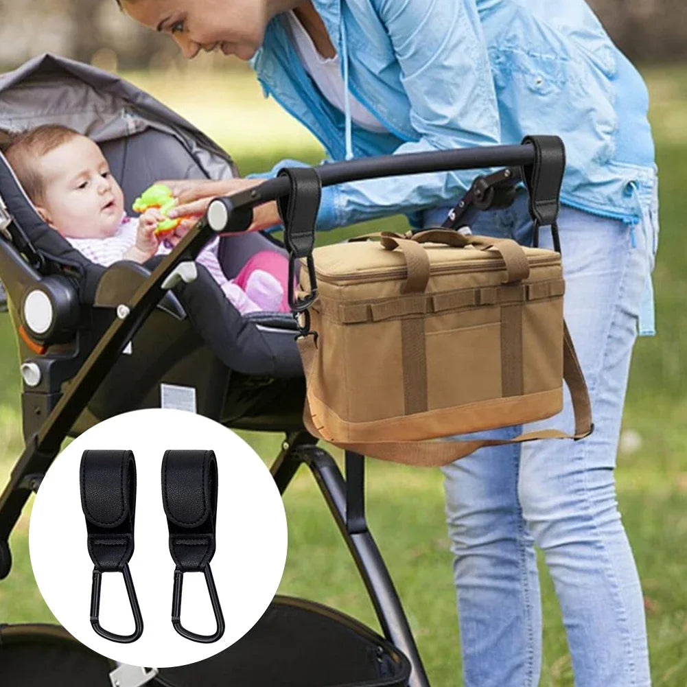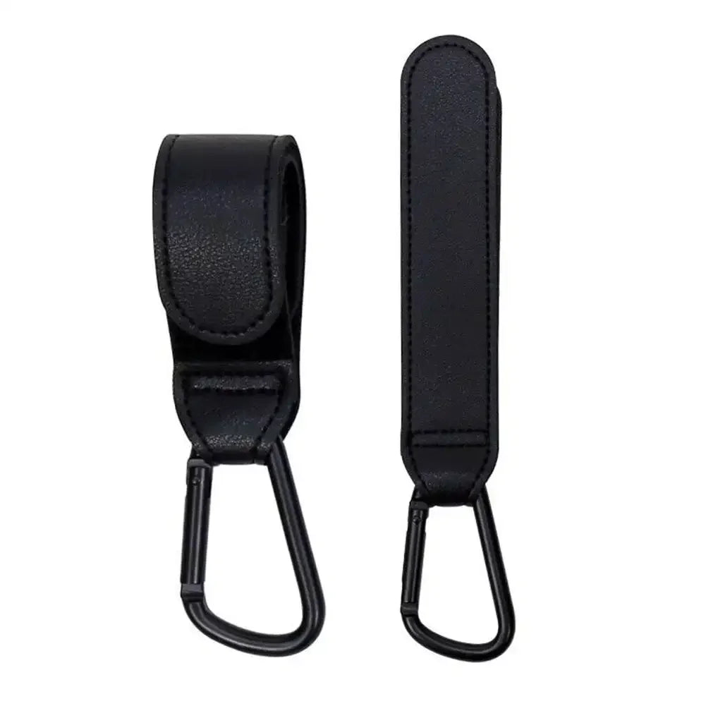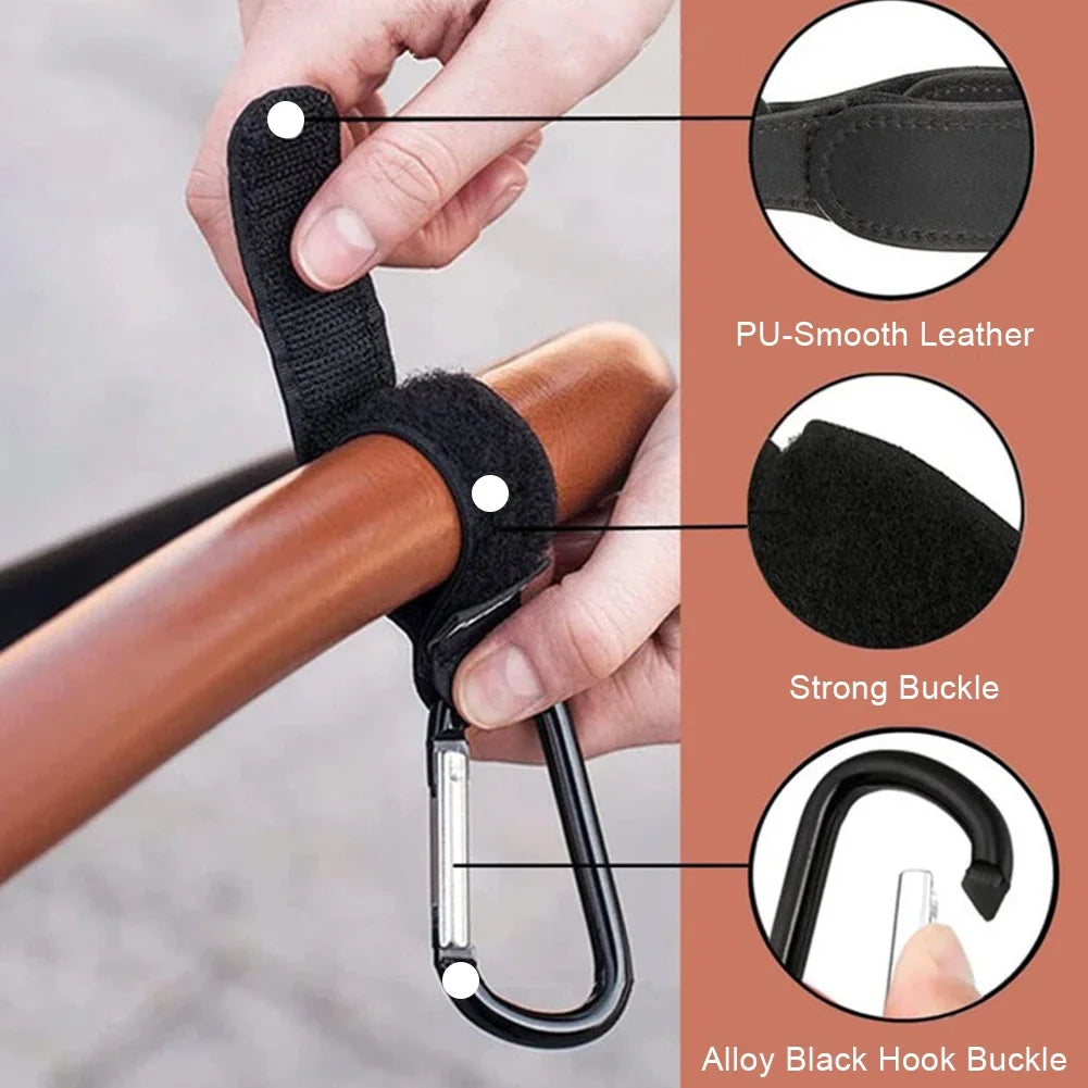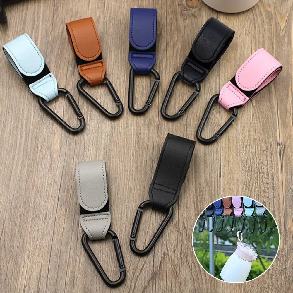 Baby Stroller Hooks Clips - Aluminum Carabiner for Pram Diaper Bag Hanging - PU Leather Strap Accessories