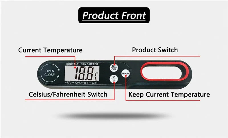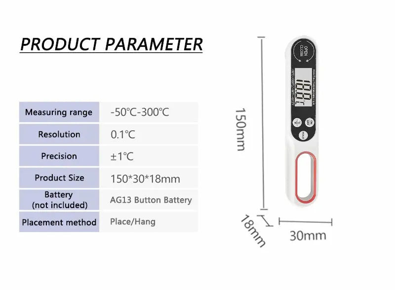 The Digital Food Thermometer offers a perfect balance of speed, accuracy, and convenience. This handheld device provides instant and precise temperature readings in just 2-3 seconds, with a high accuracy of ±1°C. Whether you're grilling, baking, or testing the temperature of liquids, this thermometer measures a wide range from -58℉ to 572℉ (-50℃ to 300℃).