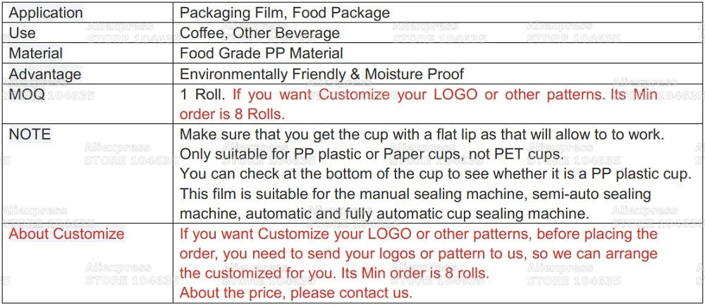 Enhance your beverage service with our high-quality Cup Sealing Film. Designed for use with cup sealing machines, this film is crafted from food-grade, non-toxic PP material, ensuring a safe and tasteless seal for your beverages. Suitable for various cup diameters (70/75/90/95mm), it fits manual, semi-auto, automatic, and fully automatic sealing machines. Each roll is capable of sealing approximately 2000 cups, making it perfect for high-demand environments such as milk tea shops, coffee shops, and fast-food outlets. Customize the film with your own logo or designs to promote your brand effectively.