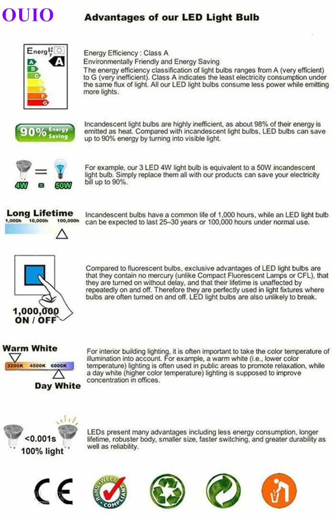 - Color Temperatures: Cold White (6000-6500K), Warm White (3000-3500K), Natural White (4000-4500K)